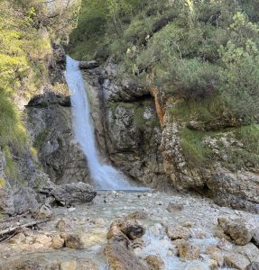 Dal rifugio iniziamo il percorso di ritorno, ad anello, che viene svolto in senso antiorario prendendo il sentiero n.490 dall’ultimo bivio incontrato durante l’ascesa al Rifugio Bosconero: la via è semplice, tuttavia, soprattutto nella prima parte, possiede una marcata pendenza che richiede la dovuta attenzione soprattutto in presenza di fango e pioggia. Dopo circa mezz’ora raggiungiamo il greto del torrente e lo attraversiamo seguendo con attenzione gli ometti presenti, proseguiamo lungo il sentiero perdendo via via quota fino a raggiungere un’ampia e amena radura nel bosco attraversata da piccoli ruscelli: non ci lasciamo distrarre dal contesto fiabesco e facciamo attenzione ad imboccare poco più giù a sinistra la traccia che ci porterà alle nostre prossime destinazioni. Il sentiero ci porta infatti rapidamente alla scoperta di due luoghi di notevole bellezza: il primo è la cascata delle Streghe e poco più in giù il nascosto Laghetto delle Streghe (Fos de Bosc Negre), una chiara e limpida pozza d’acqua. Avanziamo lungo la traccia e raggiungiamo poi la “Fontana dell’Eterna Giovinezza” e superato quest’ultima giungiamo al bivio del Pian del Mugon, tornando quindi di nuovo sul sentiero 490. La discesa finale si sviluppa lungo un tracciato misto, dal dislivello ancora abbastanza marcato, ma non difficile; giungiamo in breve al primo incrocio della nostra escursione e al tratto che ci riporta allo spiazzo del Lago di Pontisei.