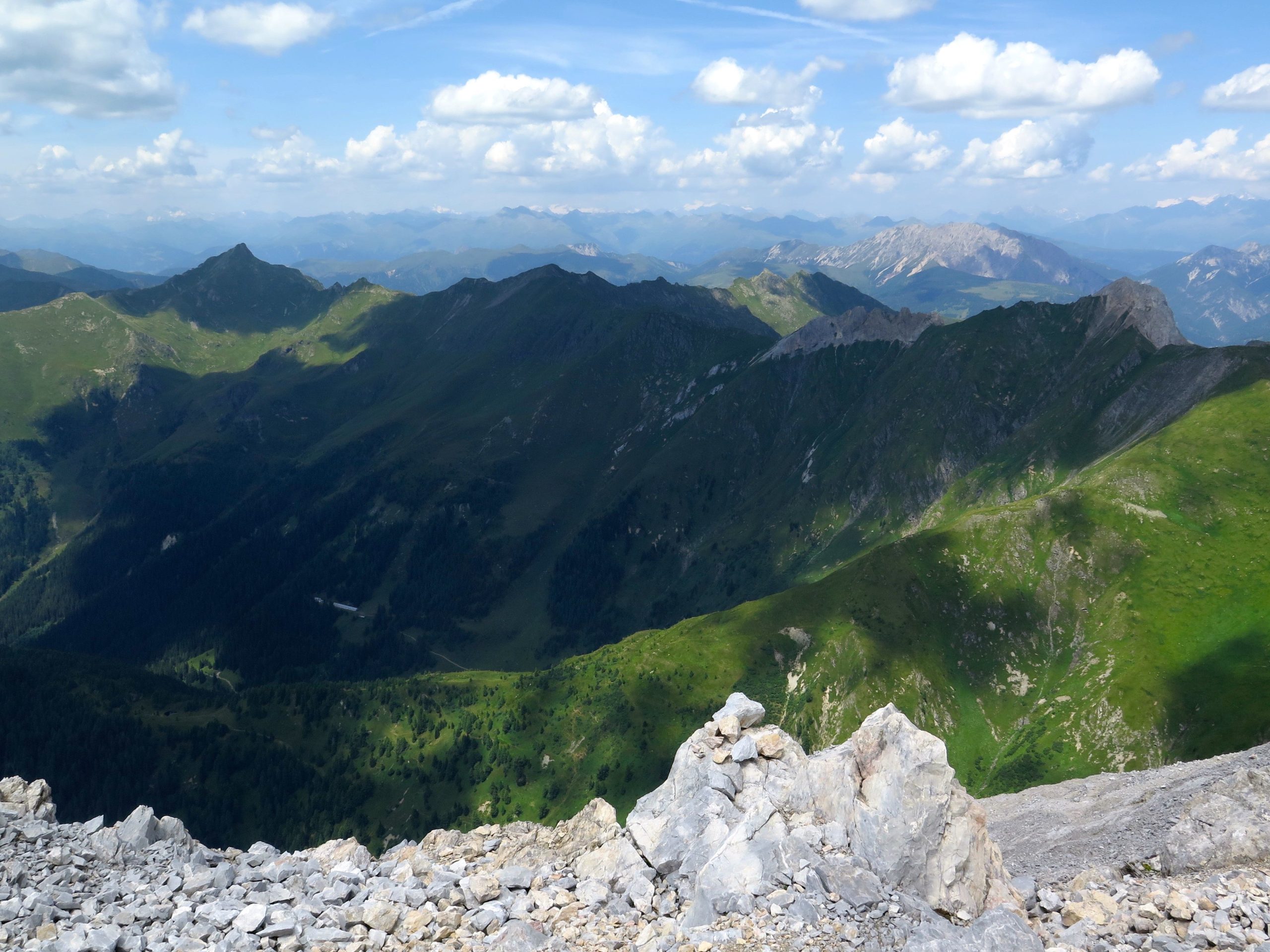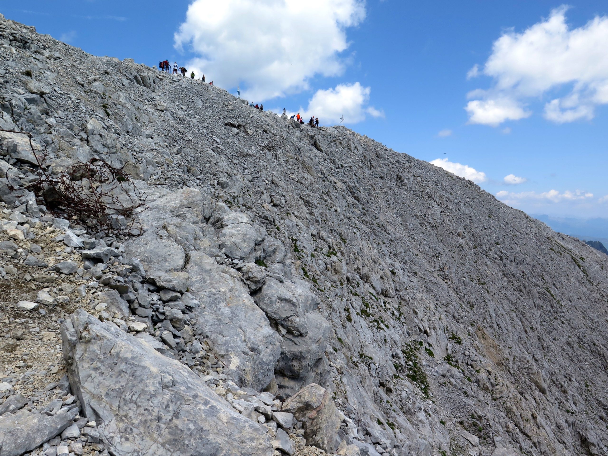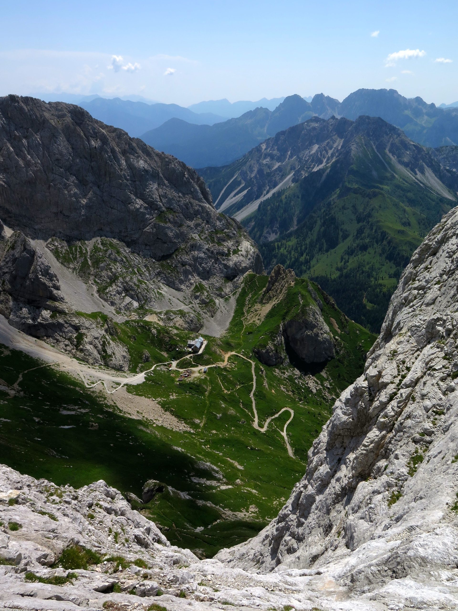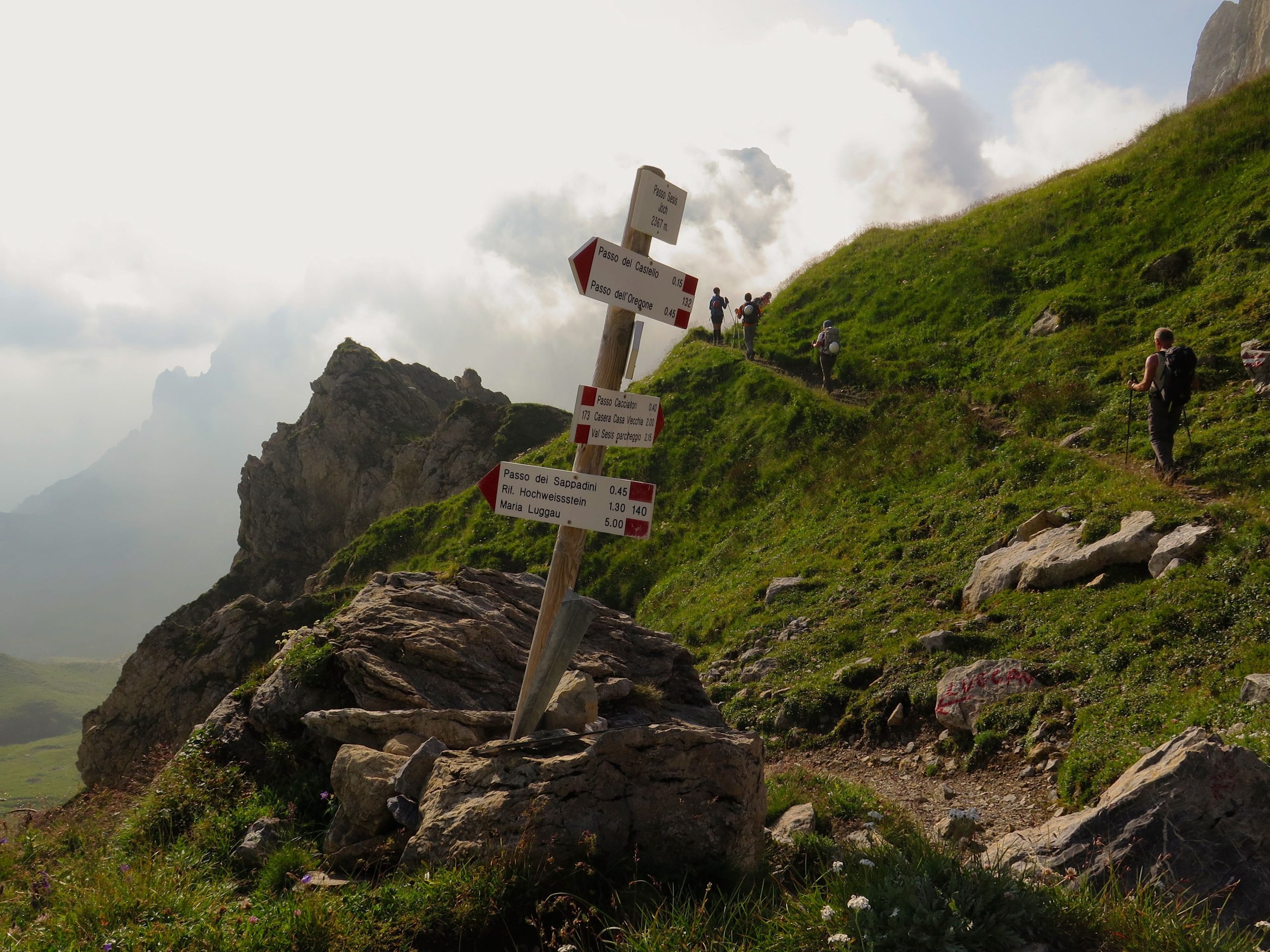 Dal rifugio percorreremo a ritroso il sentiero fatto ieri fino al passo Sesis (m 2367). Da qui seguiremo il sentiero n. 173 che con taglia orizzontalmente i prati posti sotto la parete Nord-Est del Pic Chiadenis. Poco prima di arrivare al Passo del Cacciatore un cartello ci indica di seguire la traccia a destra e in pochi minuti arriviamo all’attacco della via ferrata che risale un percorso della Prima Guerra Mondiale (1h dal rifugio). La via è conosciuta come via ferrata del Monte Chiadenis anche se in realtà la parte di salita su questo versante di Nord-Est si chiamerebbe Via di Guerra e la parte di discesa sul versante Sud-Ovest si chiamerebbe CAI Portogruaro (la sezione che ne ha curato la realizzazione). La premessa indispensabile da fare per la percorrenza della via è che bisogna stare molto attenti a non smuovere i sassi! Si sale per una decina di metri a destra di uno spigolo su roccia ben appigliata, fino a svoltare a sinistra in corrispondenza di un grosso masso incastrato in una fessura nella roccia. Si passa sopra il masso e si affronta un breve tratto in discesa in forte esposizione.Si attraversa un piccolo spigolo e ci si porta all’inizio del lungo colatoio situato tra il Pic Chiadenis e il monte Chiadenis. Qui inizia il tratto più difficile della salita costituito da ripidi camini e spigoli intervallati da brevi terrazzi. Trattandosi di un colatoio, è necessario fare costantemente attenzione al pericolo di caduta sassi. Ci si inoltra per un camino inizialmente abbastanza facile ma successivamente più difficile a causa della roccia liscia e povera di appigli. Terminato il cammino ci spostiamo a sinistra e superiamo una strettoia (attenzione agli zaini!) che successivamente si allarga e si riempie di sassi. Si restringe però quasi subito e la roccia torna ad essere molto buona anche se più levigata. Superiamo alcuni spigoli e affrontiamo un camino impegnativo che ci porta a un terrazzino. Affrontiamo poi una breve parete e un ultimo camino piuttosto insidioso. Superato questo tratto abbiamo anche superato la parte più difficile della salita al monte Chiadenis. Di fronte a noi si apre una bellissima cengia, a destra della quale sono presenti i resti delle fortificazioni costruite durante la Grande Guerra. Ci si inoltra per la cengia e si passa di fianco ad una singolare ringhiera sulla nostra sinistra (il punto è molto suggestivo). Al termine della cengia giriamo a destra e percorriamo un tratto di discesa, esposto ma non difficile. Si passa per una strettoia (anche qui attenzione agli zaini!) e si risale uno spigolo facile ma esposto fino ad arrivare a un ampio terrazzo. Dal terrazzo parte un camino attrezzato con delle staffe che ci porta su una comoda balconata proprio sotto la cima. Un’ultima facile paretina ci porta in vetta al Monte Chiadenis (m 2459 circa 2h 45dall’attacco). Anche da qua vista magnifica. Dopo la meritata sosta iniziamo la discesa verso Sud-Ovest (segnavia e ometti) dove sono ben evidenti le attrezzature che ci accompagnano lungo tutta la discesa. Si inizia scendendo per una paretina piuttosto liscia con delle staffe soltanto nella sua parte inferiore. Si continua ancora per un po’ con le attrezzature fino ad arrivare a una cresta aerea non assicurata (prudenza!). Riprese le attrezzature scendiamo intervallando tratti abbastanza facili a breve pareti inclinate e più impegnative (gli appigli comunque ci sono sempre). Superiamo un tratto non attrezzato e franoso (anche qui prudenza) e arriviamo a una cengia ben assicurata. Al termine della cengia superiamo un camino e uno spigolo che che ci porta ad un facile piano inclinato. Siamo quasi al temine della via ma dobbiamo superare una ripida parete di una ventina di metri di altezza assicurata, oltre che con il consueto cavo di acciaio, anche con una catena. La discesa va affrontata trazionando sulla catena. Si prosegue per un tratto più appigliato fino ad una seconda parete, meno difficile della prima, da affrontare sempre trazionando sulla catena. Superiamo una fessura appigliata e perveniamo a una cengia che ci conduce, senza ulteriori difficoltà, al termine della via ferrata (m 2209 2h 15’ dalla cima). Da qui, senza ulteriori problemi, discendiamo al rifugio Calvi. Restano gli ultimi 30’ di discesa al parcheggio (in totale 6h 30’)